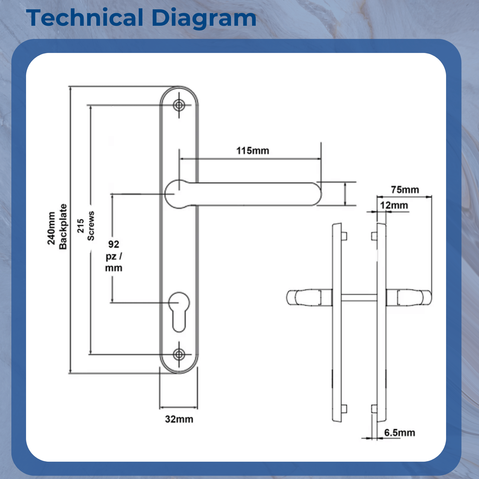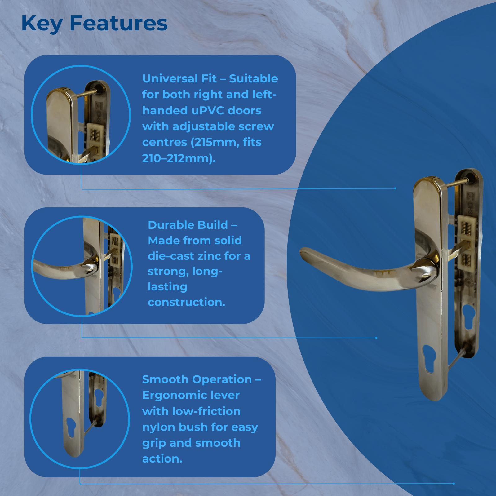 - 215mm screw centres (can suit 210–212mm on PVC doors with adjustable holes)